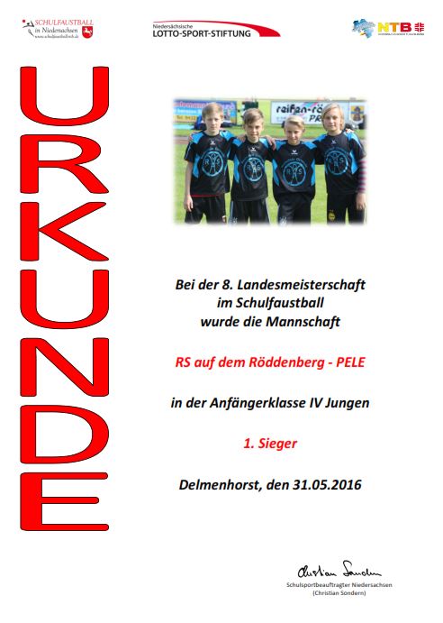 Als bestes Team Niedersachsens dürfen sich für ein Jahr die Jungen der RS Osterode in der Anfängerklasse IV betiteln. Maxi Breitenbach, Noel Limburg, Kevin Stranski und Justin Derksen mussten in einer 3er-Gruppe mit Hin- und Rückspiel gegen das Aue-Geest-Gymnasium Hersefeld eine knappe Niederlage einstecken, revanchierten sich im Rückspiel aber mit einem deutlichen 22:12-Erfolg. Zwei weitere deutliche Siege gegen die Caroline-Herschel-Realschule Garbsen bedeuteten am Ende bei Punktgleichheit aufgrund des klar besseren Ballverhältnisses die Niedersächsische Meisterschaft in der Klasse U12 vor den Hersefeldern.