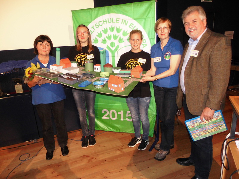 Die Schülerinnen Kaja Strüver und Sophie Waldmann aus der Klasse 8b erläuterten die Entwicklung der Projekte. Damit gehört auch unsere Schule im Jubiläumsjahr der niedersächsischen Umweltschulen zu den ca. 350 USE-Schulen in Niedersachsen. Für den Bezirk Braunschweig/Südniedersachsen waren es 14 weiterführende Schulen, die dieses Ziel erreichten. Insgesamt wurden in Niedersachsen 148 von 181 Schulen als Umweltschule ausgezeichnet.