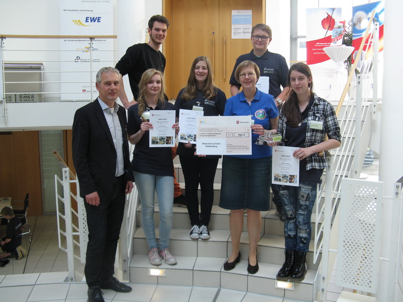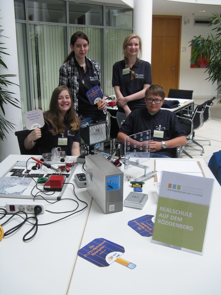 Nadine Gaidzik, Paula Richert, Isabel Rutzen und Bengt Mackensen aus der Klasse 8a der Realschule auf dem Röddenberg überzeugten die Jury mit ihrer Idee zum Thema Energiespeicher und –systeme. Um die Teilnahme an dem Wettbewerb hatten sich insgesamt 34 Schülergruppen der verschiedensten Schulformen aus ganz Niedersachsen beworben. Im Mai traten dann im Rahmen des 4. Niedersächsischen Forums für Energiespeicher und –systeme zwei Realschulen und zwei Gymnasien mit Schülern der Jahrgänge 7 bis 9 gegeneinander an.