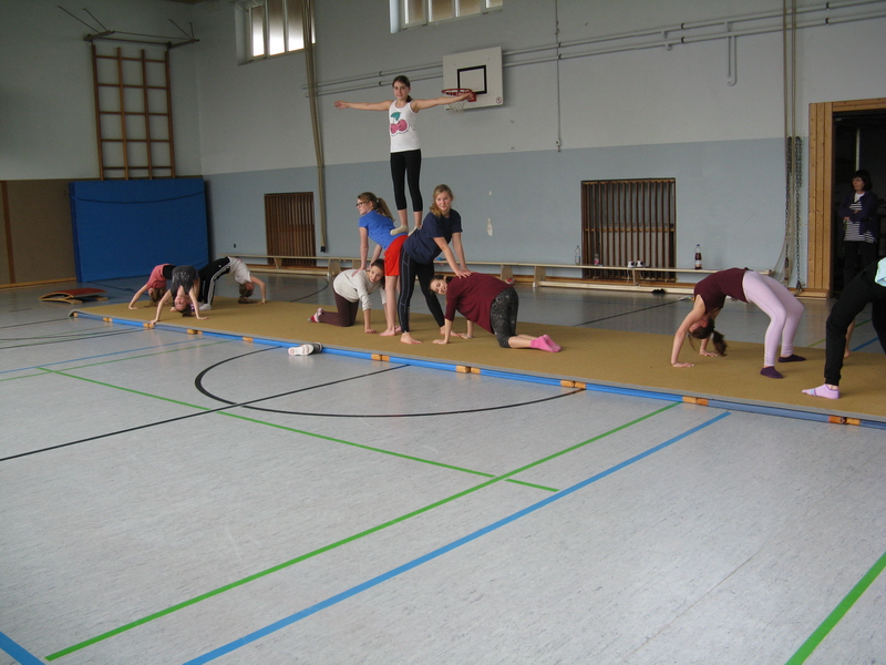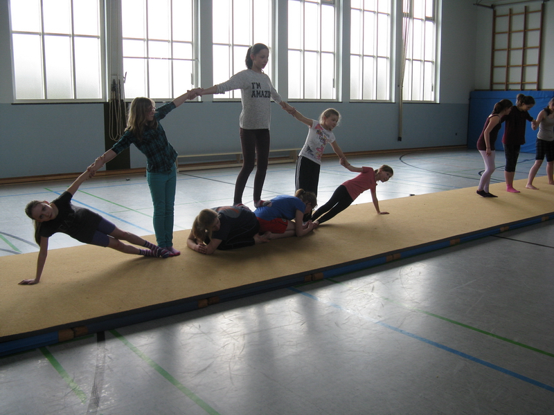In dieser AG kannst du verschiedenste Inhalte aus dem Turn-, Akrobatik- und Zirkusbereich ausprobieren, erlernen und perfektionieren. Schülerinnen und Schüler aus allen Jahrgangsstufen mit oder ohne Vorerfahrungen sind hier Willkommen. Menschenpyramiden, Luftakrobatik, Rhönrad, Turnen und Jonglage - all dies vereint unsere Akrobatik AG. Dabei steht die Freude an der Bewegung, etwas zu wagen und die gemeinsame Kooperation im Mittelpunkt.